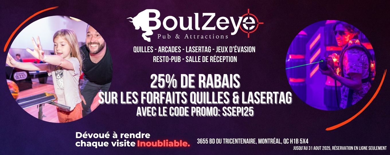 De plus, le BoulZeye vous propose une offre promotionnelle, soit 25  % de rabais applicable lors d’une réservation en ligne pour les activités de quilles et de laser tag jusqu’au début septembre 2025.
